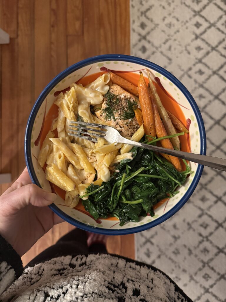 Salmon with protein pasta, spinach, and carrots